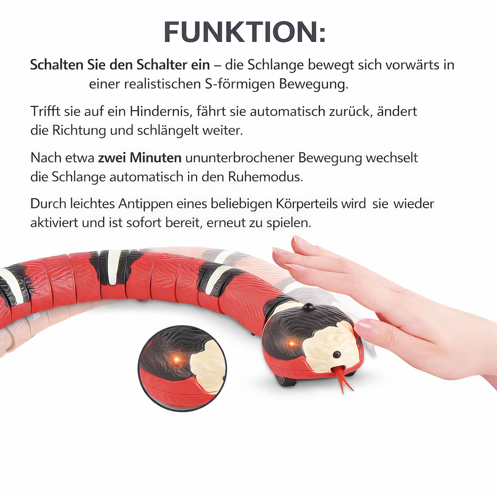 Das elektrische Katzenspielzeug in Schlangenform lässt sich bequem per Schalter einschalten und beginnt sofort, sich realistisch zu bewegen. Die selbstfahrende Spielzeugschlange fördert aktiv den Jagdinstinkt der Katze und sorgt für abwechslungsreiche Beschäftigung. Nach ca. 1 Minute Spielzeit wechselt das interaktive Katzenspielzeug automatisch in den Energiespar-Ruhezustand. Durch leichtes Antippen des Schlangenkopfes wird das Spielzeug wieder aktiviert – für endlosen Spielspaß für Katzen.